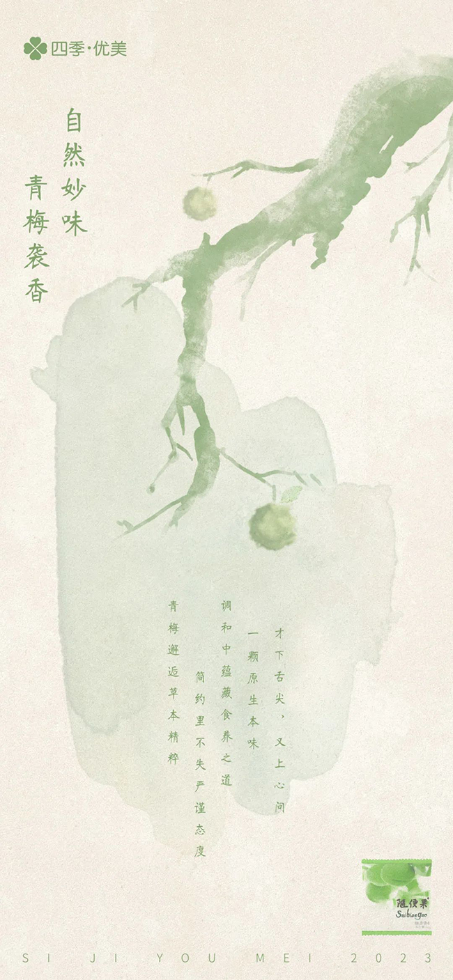每一個季節(jié),青梅都懂得如何討得人間的歡喜,用楚楚的形、盈盈的色與變化萬端的味,演繹著屬于它們的四“食”風雅。在略帶孤寂的冬天,隨便果——這顆糖漬青梅,為冷冷的日子悄然添上幾許暖意。